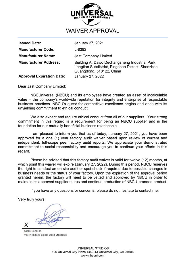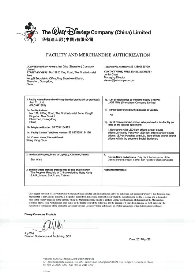 JAST is proud to have met the standards to obtain ISO9001, FSC, IETP, FAMA and NBCU certifications, and we hold several key patents on the technology that goes into our products. We have exported quality products worldwide and built key relationships with renowned customers & brands such as Disney, Universal, Hallmark, Mercedes Benz, etc.